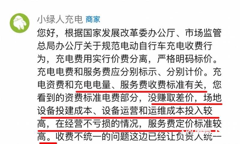 记者注意到,在小绿人充电桩小程序上,面对用户吐槽服务费不合理,后台工作人员回复表示,用户看到的资费标准电费部分,没赚取差价,场地设备投建成本、设备运营和运维成本投入较高,在经营不亏损的情况下,服务费定价标准较高。