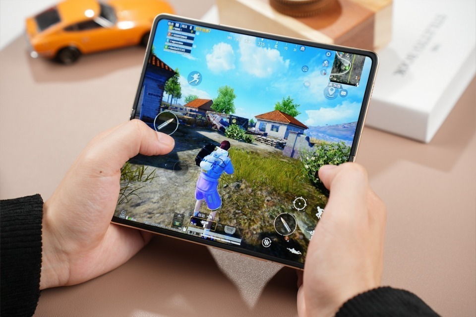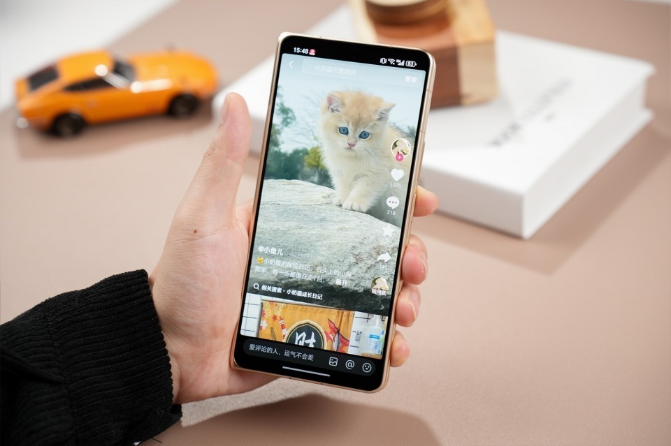 首先进行外屏半小时微信,电量剩余93%,仅消耗2%电量,微信聊天、处理工作全程流畅,外屏1.18mm的超窄黑边让视觉体验更沉浸,轻薄机身单手握持毫无压力;接着切换至内屏进行半小时爱奇艺视频播放,电量剩余89%,40分钟消耗4%电量,7.95英寸至臻黑钻屏带来超大视野,大宽幅看影视剧集极具沉浸感,而且在这期间,我甚至忘了折痕这回事,完全是平板的感觉。