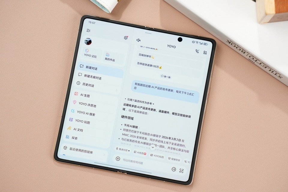 我这几天体验下来,PC级三分屏、AI一屏盯双股功能,以及YOYO帮记2.0、YOYO文档处理、AI情报官、AI会议参谋等AI生产力功能,把折叠屏+AI的生产力属性发挥到极致。从会议记录、文档编辑到信息整合,全方位提升办公效率,真正做到了“续航让你拿得住,体验让你放不下”。