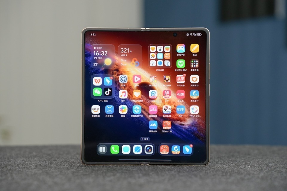 而在续航之外,荣耀Magic V6的轻薄手感与生产力体验更是锦上添花,4mm的展开厚度、8.75mm折叠厚度、219g整机重量,在展开时尽显轻薄,没有压手的厚重感,折叠时重量轻过旗舰大杯直板机,办公久握不累,通勤装包毫无负担。
